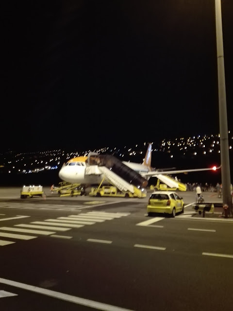 Passo pelo aeroporto ao entardecer. A descida para Machico já é feita de noite. É a primeira de muitas descidas que serão feitas por umas escadarias típicas na Madeira, extremamente escorregadias quando molhadas, devido ao musgo e às características da pedra e do cimento utilizado.